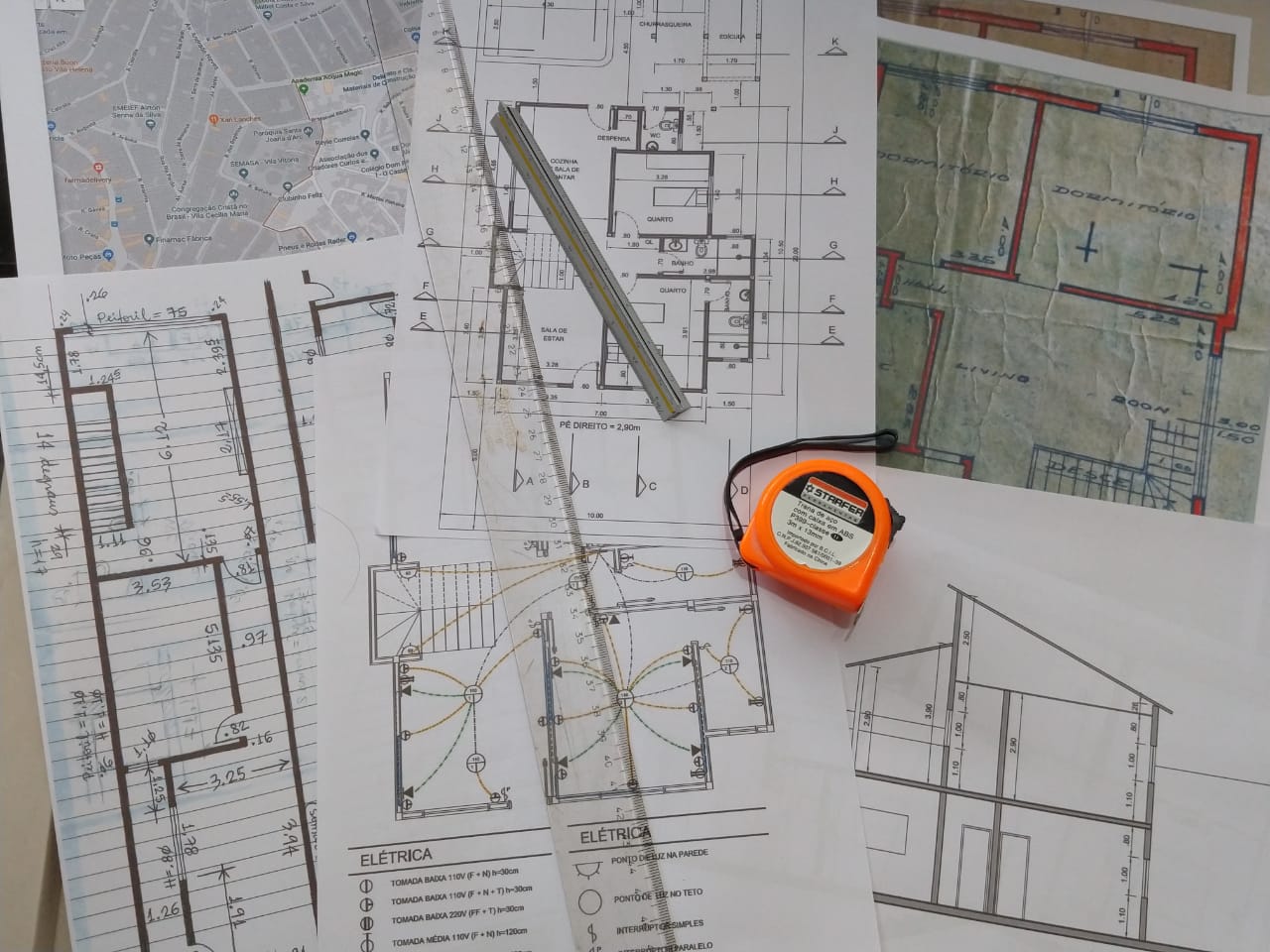 Fazemos o levantamento, desenhamos a planta nas medidas reais, incluindo cortes e fachadas. Redesenhamos a partir de fotos da planta, na ausência do Projeto Original.